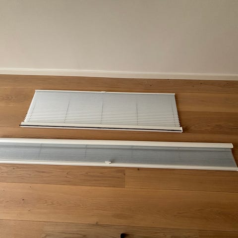 Sorte plisségardiner med snoretræk. / pleated blind.