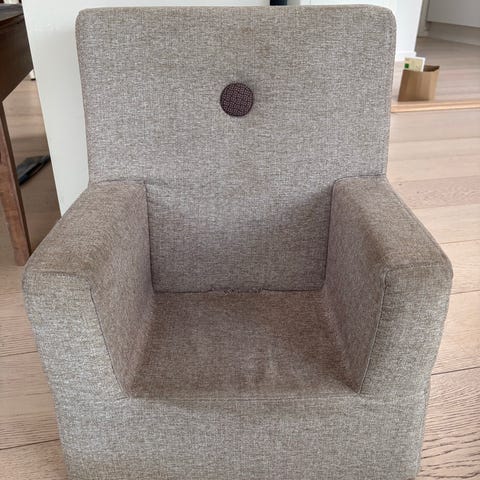 ByKlipKlap børnelænestol i grå tekstil. Brugt igennem et års tid, men i god stand.