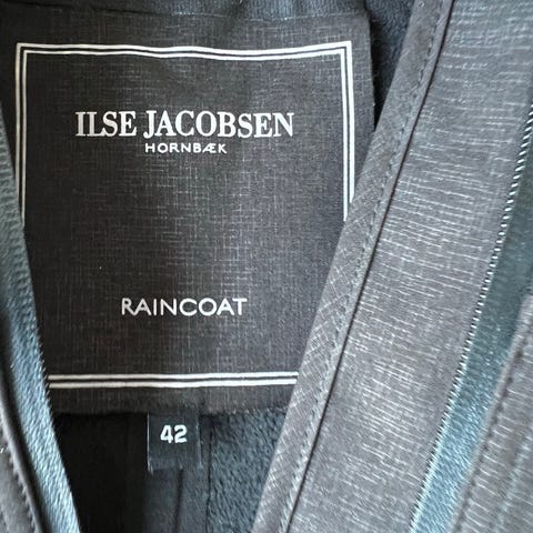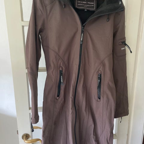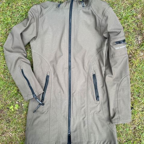 Overgangsjakke/regnjakke med hætte. Lomme på venstre overarm. Lynlås på begge ærmer (ved hænderne).