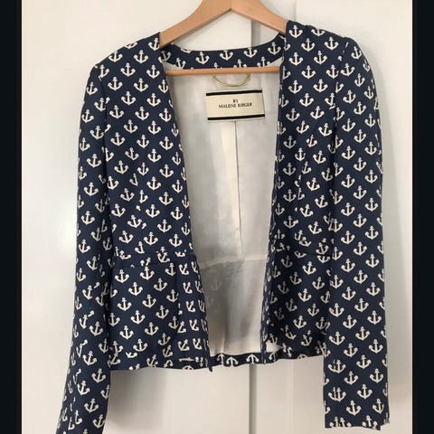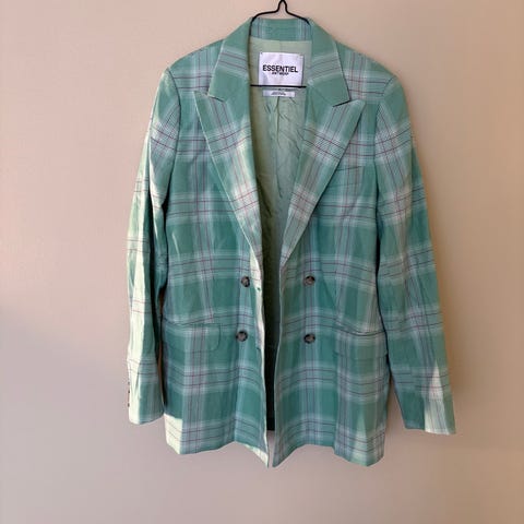 By Malina dobbeltradet blazer i grå til kvinder, med en fin tern i forskellige grå nuancer. Størrelse XL. Fremstillet af 75% polyester og 25% rayon med 100% polyester foring. Brystmål cirka 108 cm og længde cirka 78 cm. BEMÆRK blusen medfølger ikke. Velegnet til formelle og semi-formelle anledninger.