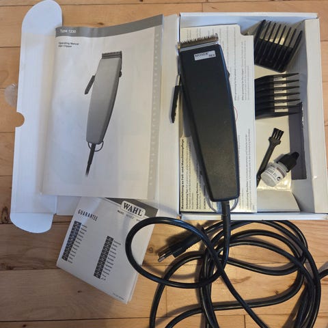 Klipper med flere skær 0,5 mm og trimmere henholdsvis 2 og 3 cm til forskellige længder samt skærer i rigtig pæn stand og klipper til negle