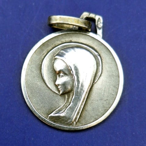På bagsiden står der "Souvenir de notre bien aimée Mère Générale 7-11-08" som kan oversættes til "Til minde om vores elskede Lederinde 7-11-08" Altså en minde medalje for en leder af en Nonneorden ( abbedisse ) eller f.eks. lederen af Nonner på et hospital, der enten stoppede eller døde d. 7. november 1908.
