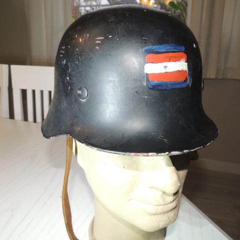 Italiensk alpejægerhat fra 1 verdenskrig ifølge Google. Der er foretaget en reparation ved Fjern se et billede. Jeg tror at kobber er en legering der er lagt ovenpå. En meget sjælden vare. Samlet højde med træopsætten er cirka 35 cm