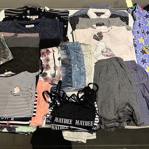 Pigetøjpakke indeholdende ti stykker tøj til sommervejr fx kjoler, toppe og “shortsbuksedragter”. Mærkerne er Name it og HM.
