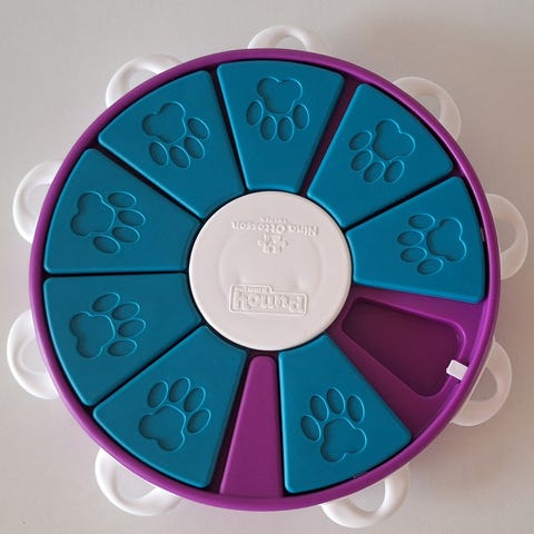 Hunden skal skubbe og vippe til legetøjet for at få adgang til godbidderne.KW aktivitetslegetøj Nina O.