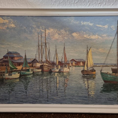 Oil painting by Georg Valdemar GUNDORFF ( 1876-1925 ) W. 120 H. 80. Gundorff was born in Aalborg, educated at art school in Berlin and Leipzig. He was a famous impressionist marine painter and his motifs are often found in Copenhague’s harbour and the city’s canals. He later received a grant from the Danish government to travel abroad and exhibited at the World Exhibition in Paris in 1900.