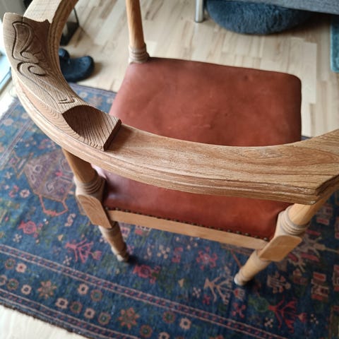 Designet forener funktion og klassisk elegance med buede armlæn, lodrette rygstave og en solid fod med fire svungne ben. Perfekt til hjemmekontoret, butiksmiljø eller som dekorativ indretning i det klassisk inspirerede hjem.