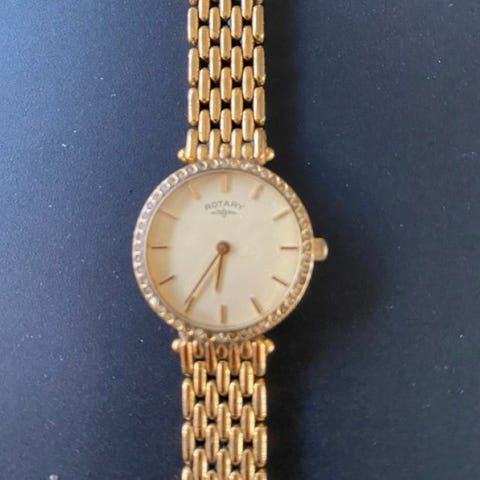 Dameur, andet mærke, Robinair. Vintage dameur med sort lak læderrem og “guld” skive. Jeg vil gå ud fra at det bare skal have nyt batteri - det virker ikke men har også ligget i en skuffe i mange år. Det er nærmest ubrugt.