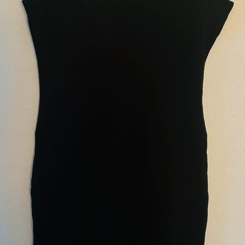 Let slå om kjole i sort med små blomster. Der er flæse fra bindebåndene i livet og langs hele kanten, og den har et flot fald. Lange ærmer med manchet med perle (se billede 2) Brugt 2 gange, så stand er flot som ny.
