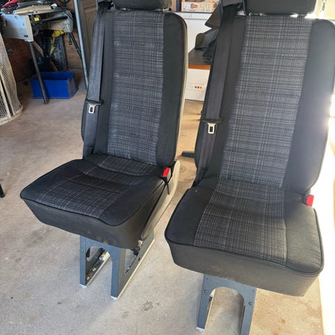 Drejeklapsæde til montering i skinner eller bund. Sammenklappeligt, så det står blant med siden af bilen. Kan afhentes eller måske leveres afhængig af destination.