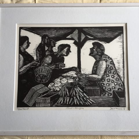 2 små Jane Muus træsnit / tryk forestillende "Ane med koen" antageligevis en reference til Johannes V jensen og "ved livets neg". Begge "eget tryk".