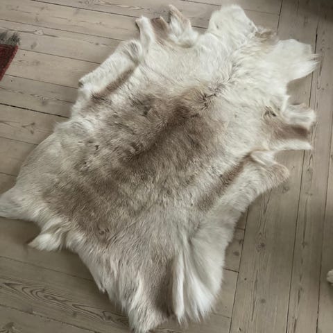Flot og velholdt stort rensdyrskind til dekoration på et sengetæppe, en stol, på væggen eller andet. Der er to små huller bagpå, men de ses ikke på forsiden.