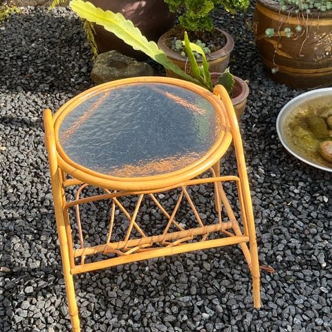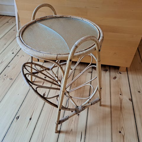 Søgeord: Bambus bord - bambusbord - havebord - lille bord - blomsterbord - hjørnebord - bord - havestue - retro - vintage - rattan bord - sidebord - kurvemøbler