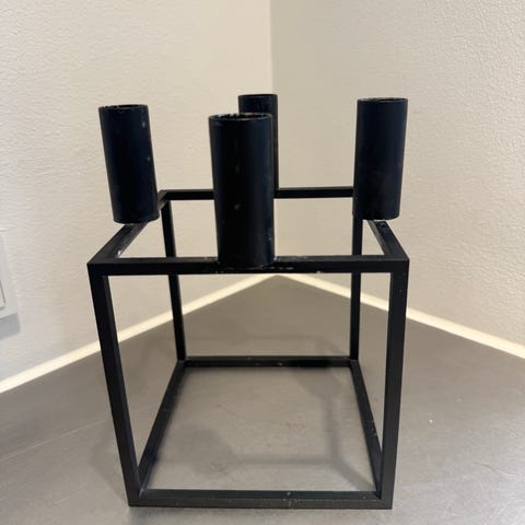 Sort lysestage i smedejern . Mål: 42 x 34 cm.