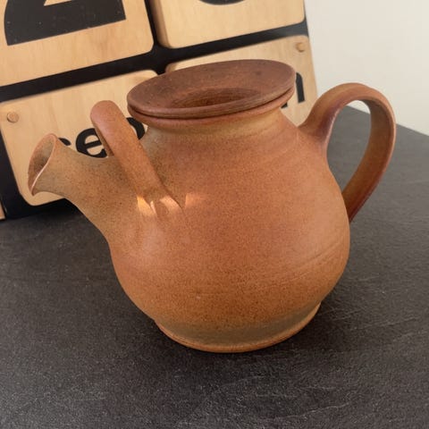 Smuk tekande af keramiker Jesper Packness. Med hans kendte orangerøde glasur. Stor nok til at nå bordet rundt med te og 70’er “vibe” til alle. 22 cm høj. Låg nedfældet i kandens top. Packness stempel under bunden. 2x1 mm. glasurafslag på tuden. Ellers ingen skader. Afhentes i Vanløse. Sendes ikke.