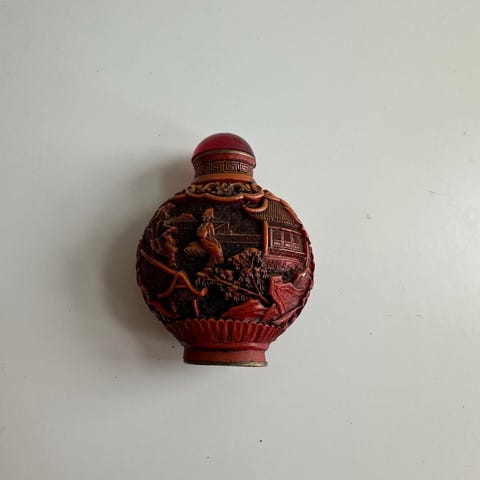 Kinesisk snusflaske af ben med erotiske motiver. Fra 18/1900 tallet. H 9 cm. B 6 cm. D 4 cm.