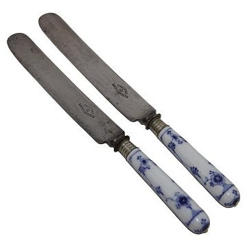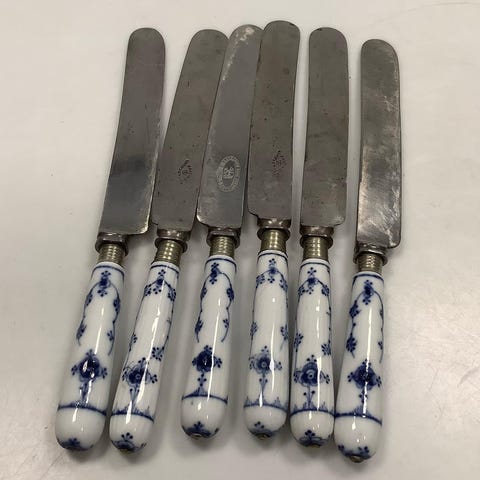 Her har vi knive der forlængst er gået ud af produktion, med raadvad stålblad og håndmalet porcelæns skafter, de er stadig skarbe og brugbare, helt fantastisk og dække op med🥰