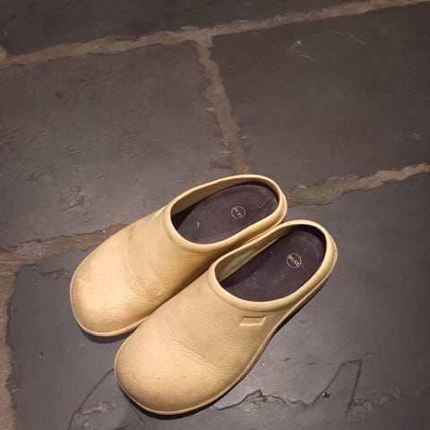 Sorte smut i gummi træsko (vist nok købt i Kvickly), brugt af et barn - som nu er vokset ud af dem.