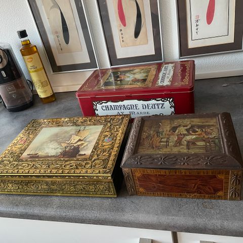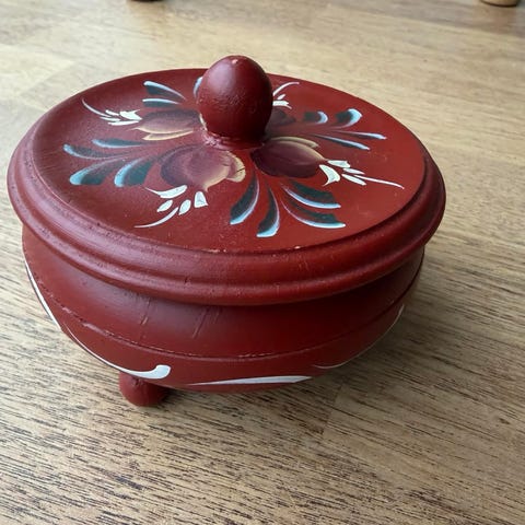 Fin gammel dåse, der måler 15 i dia og højde 5,5 cm.