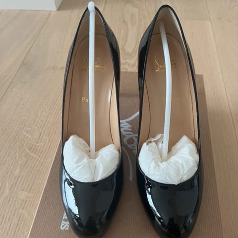 Sort slingback lak. Som nye, ingen mærker eller lign på hæl eller andet. Lidt slid på sålen.