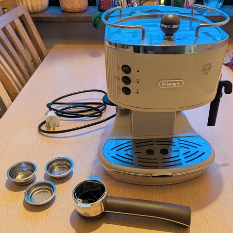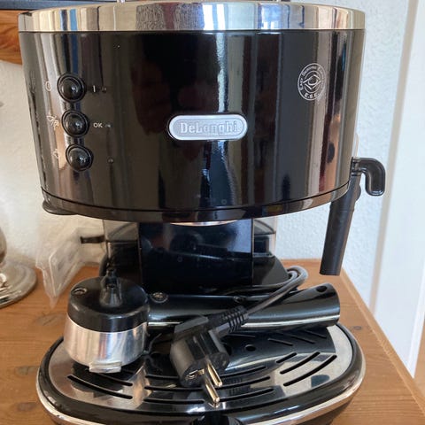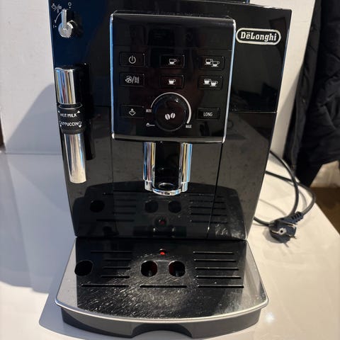 Fuldautomatisk espressomaskine med mælkeskummer og retrodesign. Bruger både bønner og formalet kaffe. Virker upåklageligt.