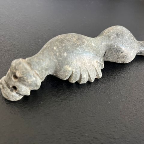 Grønlandsk Fedtstensfigur hjembragt fra Grønland for ca.35år siden. Den er signeret i bund. Mål H:11 - L:8 - B:5.5cm.
