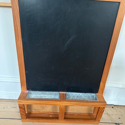 Tavlen har gennem årene været brugt til alt fra sjove kridttegninger og skriblerier, hilsner fra gæster, eksamenstræning, opskrifter, huskesedler og kærlige beskeder i hverdagen. På grund af flytning er der ikke plads til den længere. Tavlen måler 120x199 cm. Tavlen har almindelige brugsspor fra kridt og et par enkelte små slidhuller/prikker i overfladen.