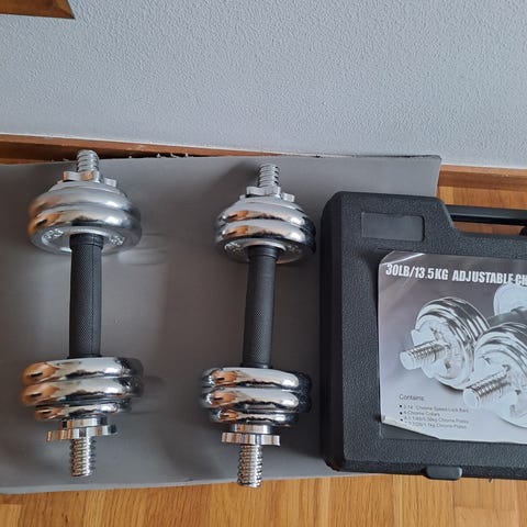 Stå som ny,8 stk små på 2,5 LB og 8 stk stor på 5 LB,20 dele i alt.Det hele for 450 kr.