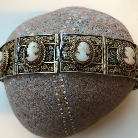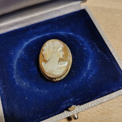 Art nouvaux kvinde i ramme af guld med øsken uden mærke. Vejer 1,0 gram 1,6 x 1,0 cm ca 1900 vurdering 1500 kom med et bud