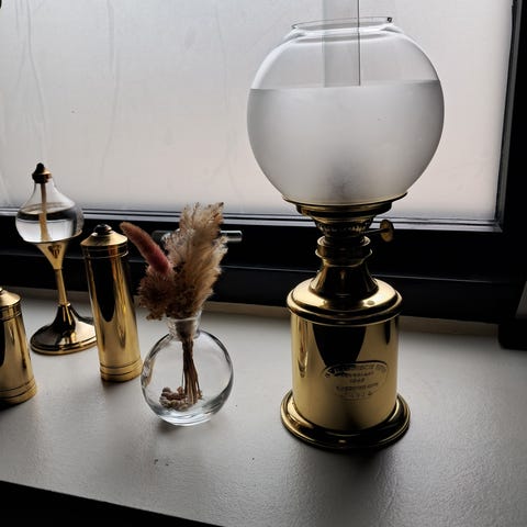 G.V. Harnisch messing olielamper med skibsophæng samt 1 ekstra glas, kan pudses op eller lad stå for patina, mål uden glas er 25 cm, glas er 14 cm, samlet mål omkring 34 cm.