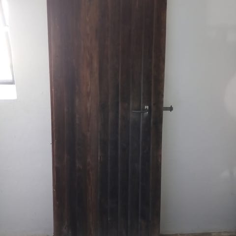 Træ dør til udendørs brug i grøn og hvid. Døren er velegnet til skure eller haveskure og er lavet af holdbart træmateriale, og g massivt træ. Den har en klassisk design med lodrette paneler og en diagonal afstivning for ekstra styrke.
