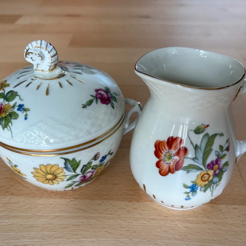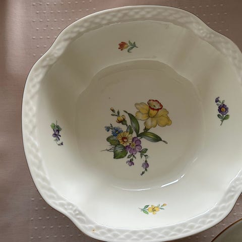 1 the kande 1 kaffe kande 1 kande 2 sovseskåle 1 stor skål med låg 1 stor skål 1 lysestage 1 lille vase 5 askebæger 1 lille skål 1 thesi 1 servietholder 1 cigaretholder 2 sukkerskåle 2 flødekander 2 små fade 2 store fade 1 kagefad 2 skåle 10 kaffekopper 6 thekopper 15 desserttallerkener 6 dybe tallerkener små 12 dybe tallerkener store 12 store middagstallerkener 14 frokosttallerken