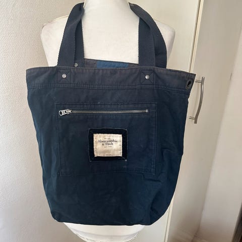 Mørkeblå med ternet lomme på den ene side og rød og blå ternet på den anden side med brun logo læder lap