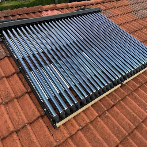 Dette brugte solfangeranlæg er designet til tagmontering og inkluderer flere komponenter til effektiv solvarmeproduktion. Fungerede perfekt ved nedtagning