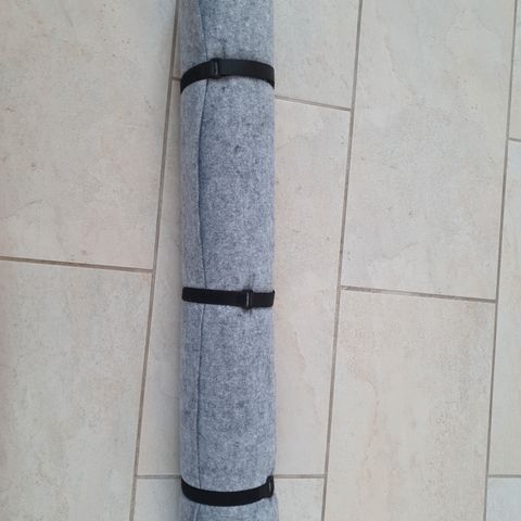 Rigtig fin måtte i grå filt incl. praktisk paprør med tilhørende elastikker.