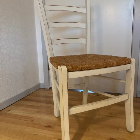 Sæt med 4 charmerende retro-stole med flet og rødt træstel.