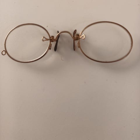 Et sæt briller i originalt etui. Stilen kaldes pince-nez og det er en halvbrille der klemmes på næseroden.