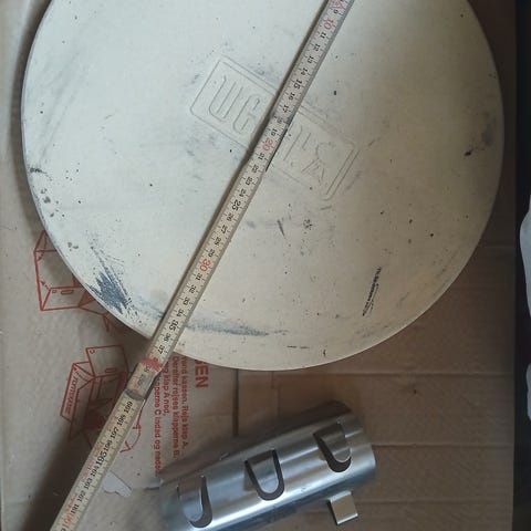 Fin pizzasten. Passer til q3200 Weber. Det følger to stål skinner med, så man kan fjerne risten i griller og lille pizzastenen direkte i grillen. Bager rigtig god pizzabunde. Ny pris 850.