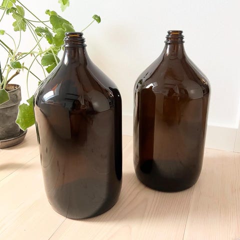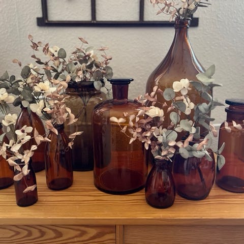 Flot stor apotekerflaske i smuk brun gylden farve. Flot alene eller med siv eller andre tørrede blomster i. 30 cm