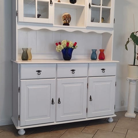 2 delt hvidt Vitrineskab af helmalet træ. Udvendig hvidt,indvendigt hvidmalet.Front med glaslåger.
