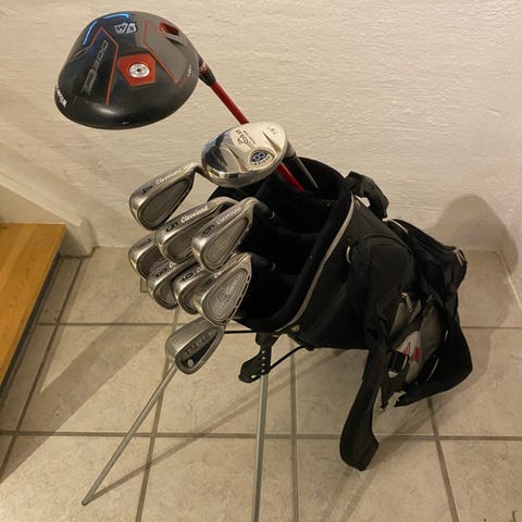Sættet sælges med den legendariske Cleveland Tour bag, der rummer alt nødvendigt. Baggen har brugsspor på overkanten og nederst (se de sidste to billeder), men er ellers rigtig fin og alt virker (lynlåse inklusivt). Der medfølger et regncover.