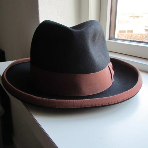 Flot vintage homburg-hat fra Battersby, London. Oprindeligt solgt i Valdemar Johansen, Ryesgade Hattemagasin i Aarhus.
