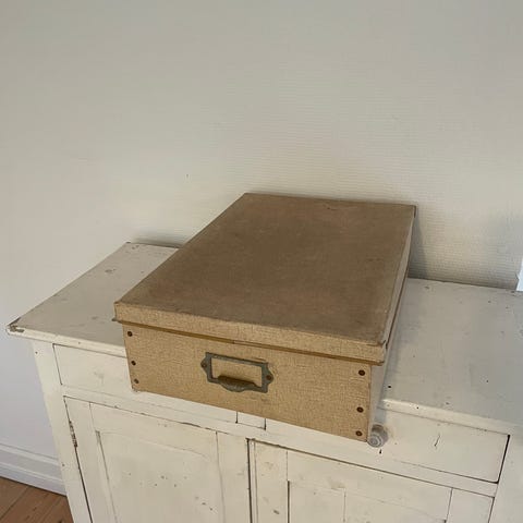 Gammel arkiv kasse med opdeling i samme look, som resten af kassen. Har et lille håndtag forrest og indstik til at skrive indhold.