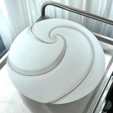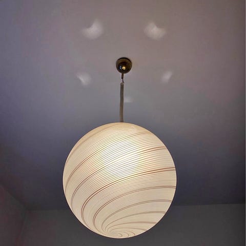 Smuk, håndlavet, italiensk glas kuppel med mørke smalle og brede chokoladefarvede swirls rundt om kuplen. Lampen er designet af Lino Tagliapietra fra La Murrina i 1960'erne.