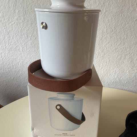 Om Isspanden: Spanden er udført i et stilrent design med en smuk, lys emaljeret overflade (farven er en elegant nuance af creme/lysegrøn) og er prydet med originale træhåndtag, der tilføjer et varmt og autentisk præg. Den er designet til at holde dine isterninger kolde i lang tid og leveres komplet med sin originale matchende metal-ske, som elegant opbevares inde i spanden.