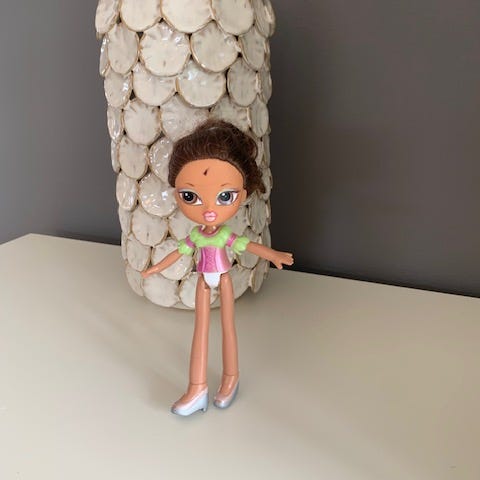 Bratz dukke med blondt hår iført en ternet nederdel og støvler. Dukken har et karakteristisk ansigt og er velegnet til leg og samling.