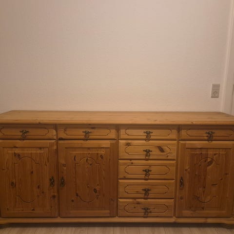 Jeg har denne her retro skænk, men da den ikke kommer til at passe med de andre møbler jeg kommer til at at få, så sættes den til salg, skænken er i fuld 100% ægte træ hvilket vil sige at du kan slibe den og male den om i din helt egen farve og give den nye håndtag, hvilket kunne blive godt til den!