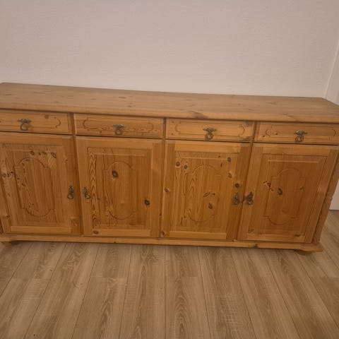 Jeg har denne her retro skænk, men da den ikke kommer til at passe med de andre møbler jeg kommer til at at få, så sættes den til salg, skænken er i fuld 100% ægte træ hvilket vil sige at du kan slibe den og male den om i din helt egen farve og give den nye håndtag, hvilket kunne blive godt til den!