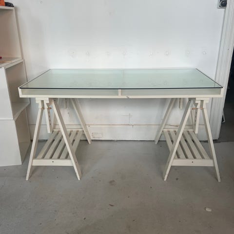 Glasplade har brugsmærker men et virkeligt kraftigt kontorbord som er kommet til overs. Ny pris over 12.000kr. Har været brugt som kontor bord.