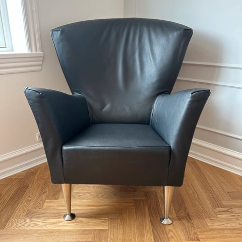 Flot design læder lænestol. Sidder rigtig godt i den.